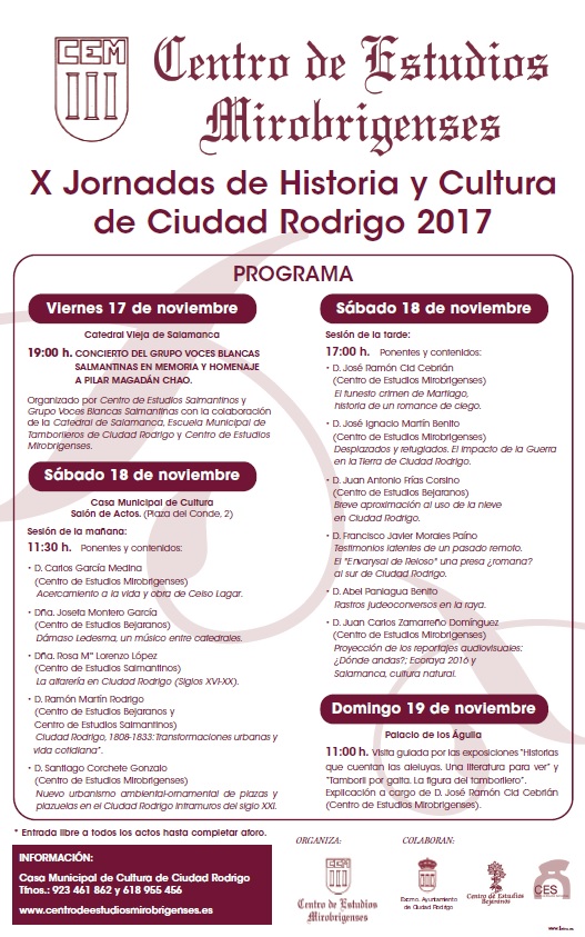 El Centro de Estudios Mirobrigenses se complace en anunciar la próxima convocatoria y celebración de las X Jornadas de Historia y Cultura de Ciudad Rodrigo que tendrán lugar en el Salón de Actos de la Casa de Cultura los días 17 al 19 de Noviembre gracias a la colaboración del Ayuntamiento de Ciudad Rodrigo, el Centro de Estudios Salmantinos y el Centro de Estudios Bejaranos.