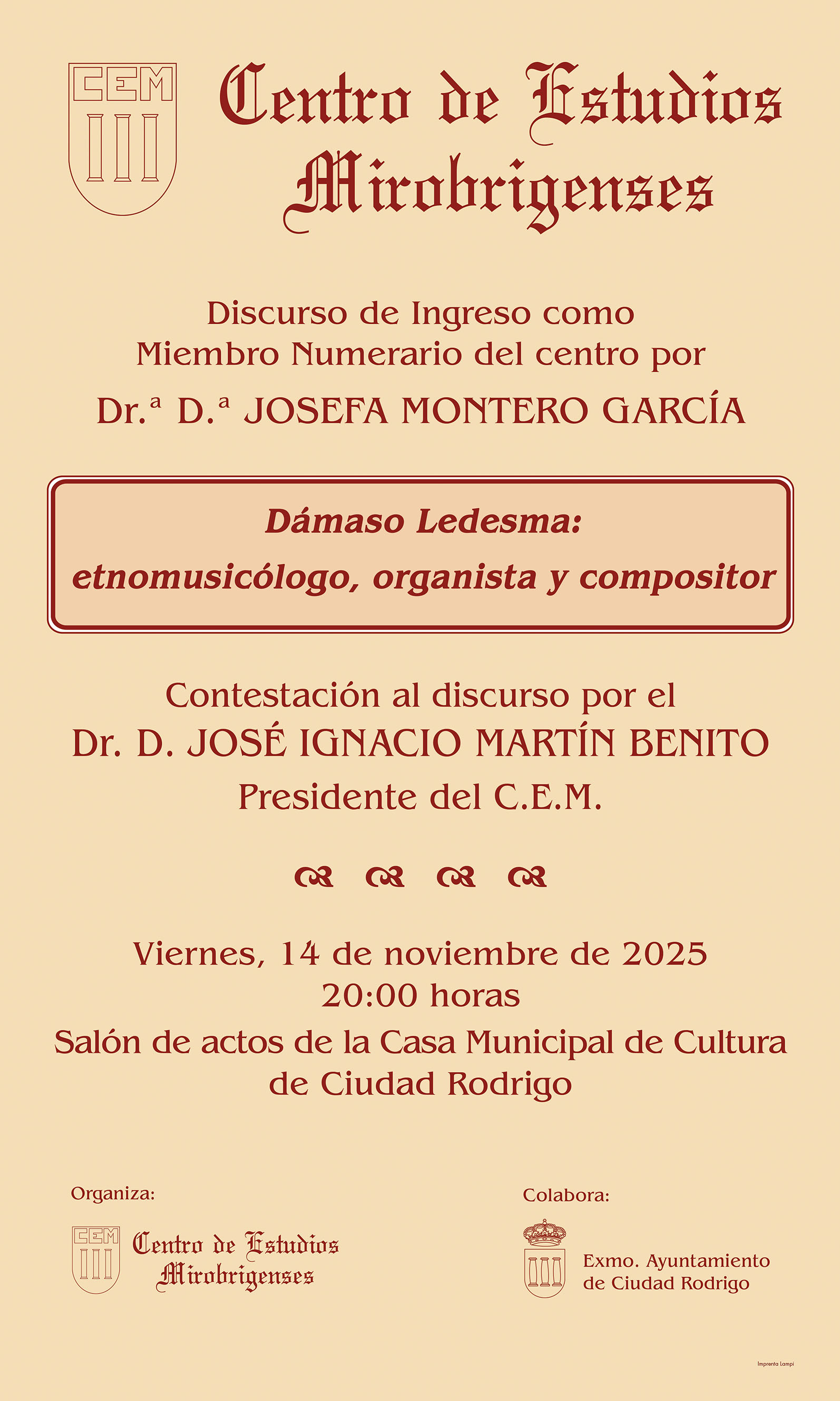 El próximo día 14 de noviembre de 2025 a las 20:00 horas el Centro de Estudios Mirobrigenses celebrará Sesión Académica con motivo del discurso de ingreso de doña Josefa Montero García, que tendrá lugar en el salón de actos de la Casa Municipal de Cultura.